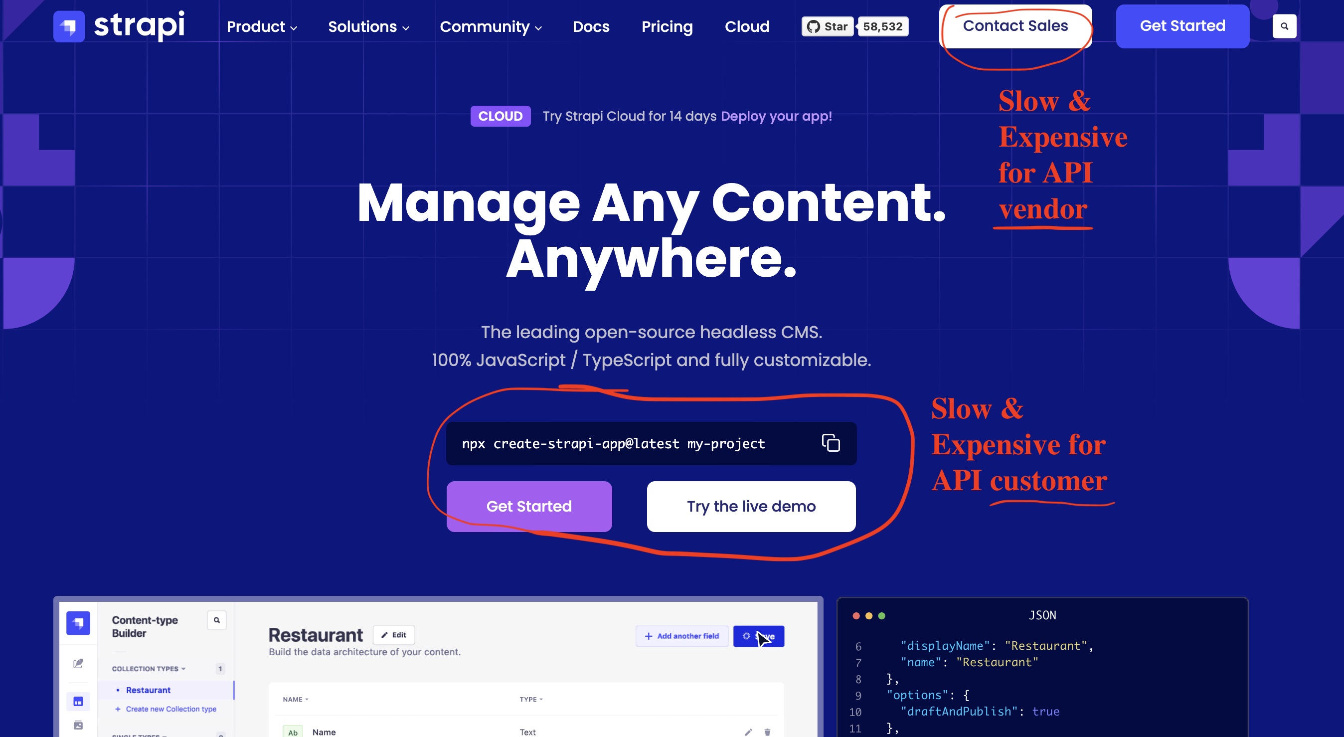 Now this wouldn't be so bad if the API vendor decision could be easily reverted, but it can't. In fact, it is so costly that the capital outlays are not economical in 4/5 cases and the sub-optimal choice is accepted with technical debt accruing. API buyers are so mindful of this phenomenon that they created a term for it: vendor-lockin. You want to switch, but the switching costs are so high that you are effectively locked into the sub-optimal choice forever. API buyers also created a term for the only solution they know: vendor-agnostic, which refers to products that abstract over multiple vendors behind one interface. This barely solves the problem though, as you have now even more abstractions and overhead to deal with, which slows you down even in the case where you never end up switching vendors.